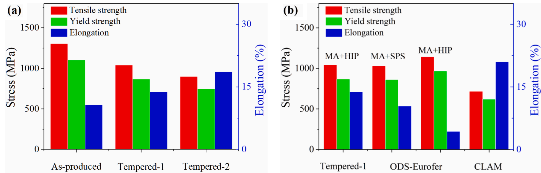 图3 ODS-CLAM-Zr钢室温拉伸性能:(a)不同热处理工艺下材料的力学性能,(b)与其它材料拉伸性能对比