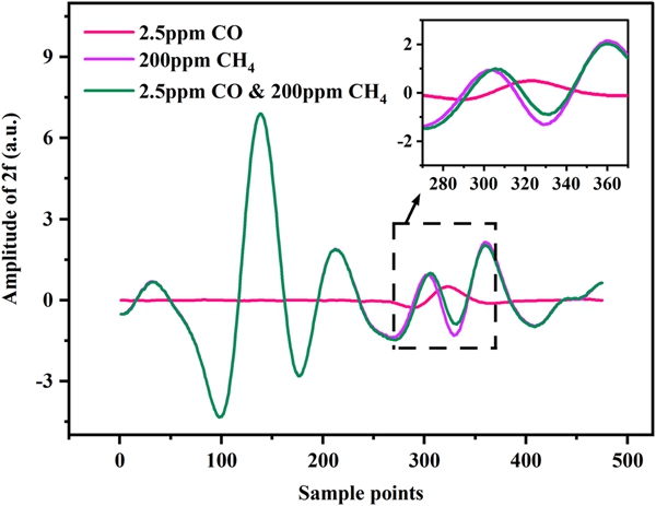 CO和CH4分别测量和混合气测量的二次谐波信号情况