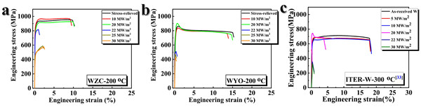 研究团队基于EBMP-30电子束热负荷平台,以两种代表性的弥散强化钨材料W-0.5wt% ZrC(WZC)和W-1.0wt% Y2O3(WYO)为研究对象,在10-30 MW/m2热负荷功率密度(APD)范围内,研究了多次热负荷冲击下材料的损伤行为。当APD ≤ 20 MW/m2时,WZC和WYO试样的微观结构和拉伸性能(图2)相比初始样品均无明显变化。但当APD ≥ 22 MW/m2时,WYO试样发生再结晶和明显的晶粒长大,同时观察到Y2O3颗粒从W基体脱落,WYO的极限抗拉强度(UTS)从861 MPa下降到510 MPa,总延伸率(TE)从15%下降到接近零(图2b)。结果显示,由于Y2O3颗粒与W基体之间的热膨胀系数不匹配,热加载过程中粗大的Y2O3颗粒受热膨胀会挤压W基体,使W基体发生不可逆的塑性变形,冷却后Y2O3颗粒收缩导致Y2O3颗粒与W基体之间形成微裂纹,最终在多次热疲劳作用下粗大的Y2O3颗粒从钨基体脱落,形成孔洞和宏观裂纹(图3)。而WZC由于高的再结晶温度(RCT)(~1300 oC),在22 MW/m2的热加载后,仅发生部分再结晶,仍保持816 MPa高的UTS值(图2a)。此外,由于WZC合金中ZrC的热膨胀系数与W基体相当,且ZrC颗粒尺寸细小、分布均匀,有效避免了ZrC颗粒脱落和微裂纹的形成。
