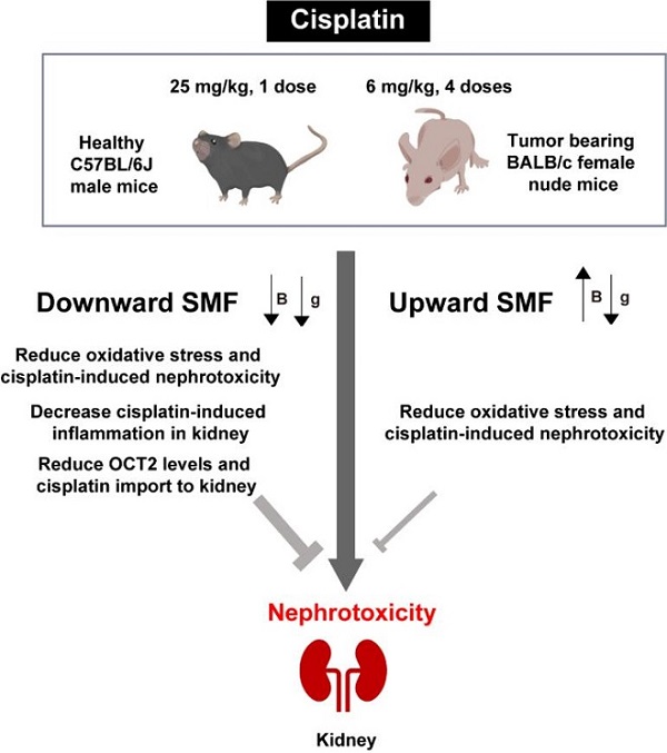 图2. 中等强度近均匀稳态磁场改善化疗药物顺铂引起的肾损伤。