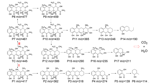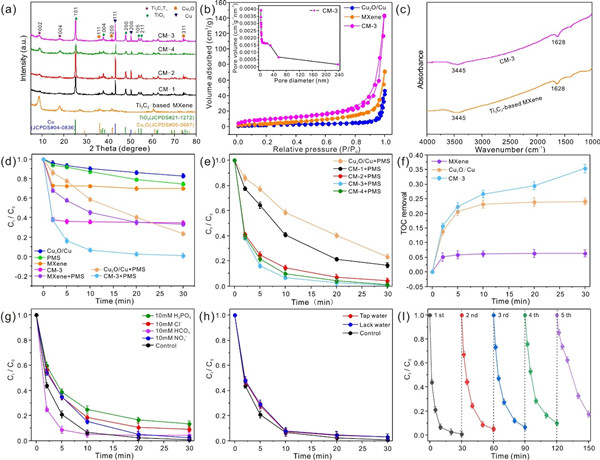 鉴于此,研究人员将MXene与铜氧化物Cu2O/Cu结合,成功构筑了具有纳米限域结构的新型催化剂Cu2O/Cu@MXene,并选择四环素作为降解目标,研究了Cu2O/Cu@MXene的催化降解性能。结果表明,在最佳降解条件下,四环素的去除效率在30 min内达到了99.14%,准一级动力学常数为0.1505 min-1,是Cu2O/Cu的3.2倍。这种出色的催化性能主要归因于Cu2O/Cu@MXene中的MXene能够促进四环素的吸附和Cu2O/Cu纳米颗粒之间的电子传输。EPR分析和猝灭实验表明,Cu2O/Cu@MXene/PMS体系中的主要活性氧物种是.OH。基于LC-MS监测到的降解中间体,研究人员提出了在这种非均相类芬顿体系中去除四环素的两种可能路径。该研究为设计环境友好、催化活性高的类芬顿催化剂提供了纳米约束构建策略,进一步拓宽了MXene在高级氧化领域的应用。