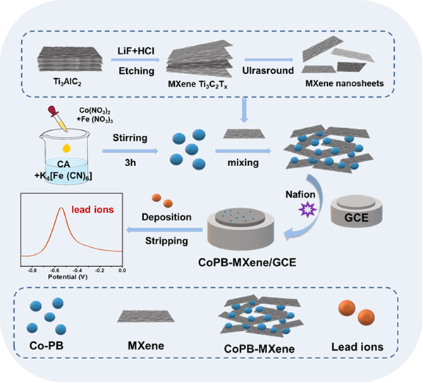 针对此类问题,课题组开发出基于钴掺杂的普鲁士蓝结合MXene材料的便携式电化学传感器。该传感器可以检测纳摩尔浓度的铅离子,同时也展现出较高的抗干扰能力,良好的稳定性,并在瓶装水、自来水和湖水等真实样品检测中均表现出出色的铅离子检测性能。