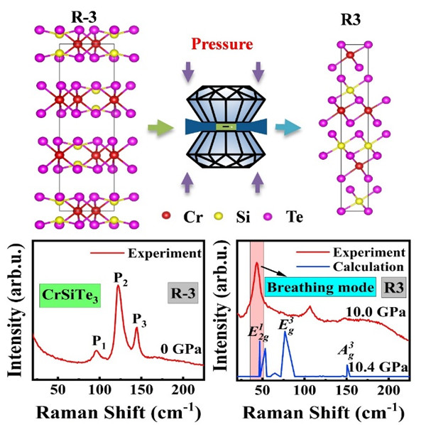 二维磁性材料因具有高度可调的物理性质以及在自旋电子学中的潜在应用价值,近年来引起了研究者的广泛关注。二维层状材料由于层间只靠微弱的范德瓦耳斯力(vdW)作用连接, 可通过机械剥离法将其减薄至原子级厚度。具有磁各向异性的二维磁性材料, 其物理性质与层数、堆叠形式等密切相关且可被多种外场调控。其中,CrSiTe3作为一种二维铁磁半导体,由 CrTe6 八面体单元形成六角蜂窝晶格, 剥离后仍能保持长程磁序等诸多优异的物理性能,同时也是一种带隙可调的拓扑磁性材料。虽然,已有研究发现了CrSiTe3中压致超导电性和磁性的增强,但是其高压结构尚不清楚,这不利于分析和理解压力诱导的新奇现象和机制。为了解决这一难题,研究团队结合超低频高压拉曼光谱实验和第一性原理计算,明确了高压下CrSiTe3的结构。
