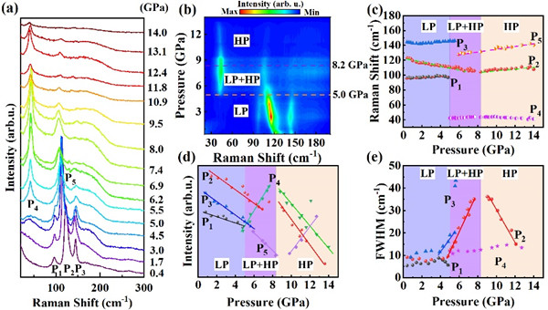 研究团队采用机械剥离法获得了少层的CrSiTe3薄片,并将其置于金刚石对顶砧装置(DAC)中进行高压实验,利用超低频高压拉曼光谱技术系统地研究了二维层状铁磁半导体CrSiTe3的压力诱导结构相变。该实验首次在CrSiTe3中中观测到位于42.1 cm-1左右的层间呼吸模式。结合理论计算,发现CrSiTe3在大约5.0 GPa到8.2 GPa之间经历了从R-3到R3空间群的结构相变,并伴随着居里温度(Tc)的显著提高。该研究明确了CrSiTe3的高压结构,提供了一种调节及探测二维vdW材料层间耦合的有效途径,并表明层间耦合的增强可以显著提高CrSiTe3的铁磁性,这有助于进一步理解CrSiTe3的构效关系,为设计具有高性能二维vdW铁磁体提供了指导。