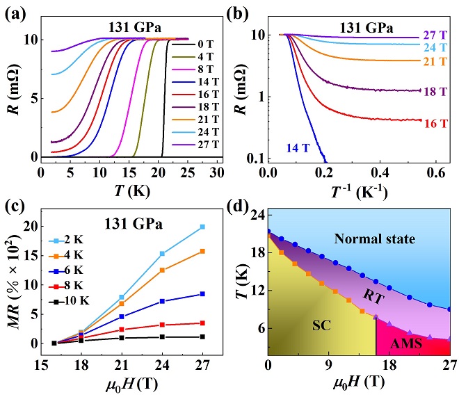 图:超高压下单质钛中反常金属态的实验证据以及温度-磁场相图