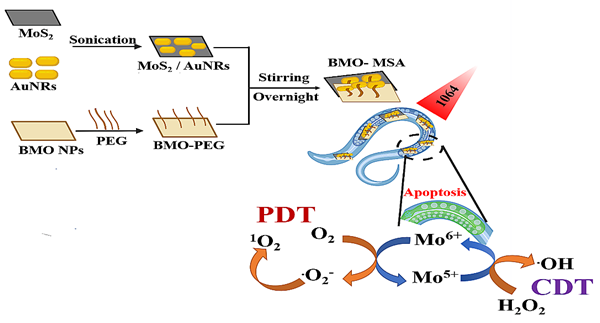 Bi2MoO6(BMO)纳米材料已被广泛用于光催化应用,如有机污染物的分解和制氢。但对于光动力治疗(PDT)来说,BMO的光吸收在紫外区域,不适合临床应用。为此,研究人员将BMO和MoS2/AuNRs相结合,制备了一种新的纳米复合材料,即Bi2MoO6/MoS2/AuNRs(BMO-MSA),它可以增强近红外区域的光吸收从而有增强PDT效应,并且它有过氧化物酶(POD)活性,同时可以引起化学动力治疗(CDT)效应。研究结果表明,研究团队所制备的BMO-MSA纳米复合材料不仅在1064nm波长的光照射下能产生单线态氧(1O2)杀死癌细胞,而且还可将H2O2转化为羟基自由基(?OH),同时具有CDT杀癌细胞的功能。