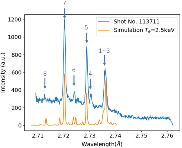 除了开展钨杂质光谱研究之外,课题组也进行了其他可行的面向聚变堆的弯晶谱仪关键诊断技术的探索,开展了基于氙(Xe)光谱谱形分析进行高参数等离子体离子温度与旋转速度测量的可行性研究。通过原子物理程序开展模拟计算,验证了氙光谱测量离子温度的可行性,并在EAST物理实验上首次测量到与理论预测相符的氙谱线,并基于Xe杂质谱线分析,获得了离子温度等等离子体参数【链接4,5】。
