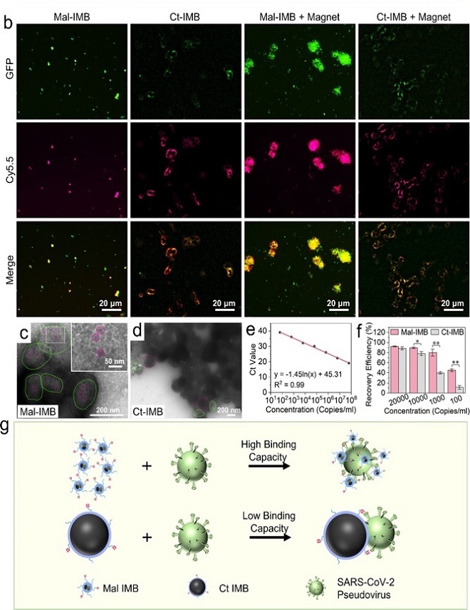 在本研究工作中,基于此前课题组仿生矿化合成的研究(Journal of Materials Chemistry B, 2017, 5(16): 2888-2895;ACS Applied Materials & Interfaces, 2020, 12(51): 56701-56711.PNAS,2022,Vol. 119 No. 45,Chemical Engineering Journal 454 (2023) 140440),研究团队通过在超小类磁小体纳米颗粒表面进行修饰,并与针对S蛋白RBD区域的超小单链抗体片段(RBD-scFv)抗体结合,成功获得高效超小免疫磁珠,用于识别RBD抗原和结合SARS-CoV-2假病毒。由于类磁小体颗粒不仅表现出优异的磁性能、高均一性和化学稳定性,而且小尺寸优势带来的超高比表面积,凸显其稳定的捕获能力和优越的结合效率,为COVID-19的快速有效富集和分离提供了可能。实验结果表明,相对于商业磁珠,Mal-IMB在复杂生物环境中展现出83μg/mg的最大病毒装载能力,并且可有效富集低至70拷贝/mL的假病毒。另外通过免疫荧光和透射电镜实验工作,进一步阐明了超小磁珠在复杂生物环境中高效富集的机制,不仅展示了新型免疫磁珠的功效,还为其在复杂生物环境中的性能改进提供了有价值的见解。