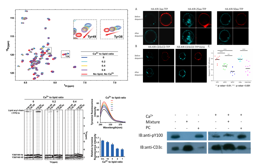 这项工作不仅填补了T细胞信号跨膜传导研究的空缺,完善了T细胞受体的磷酸化模型,更重要的是丰富了生物体内钙离子的生理功能。传统的观点认为钙离子的第二信使作用主要是通过结合钙调蛋白实现的,该文章首次提出了钙离子可以通过调控生物膜与膜蛋白质之间的相互作用发挥生理功能。这种调控途径不仅存在于T细胞受体和免疫受体信号通路中,在其他众多生物过程的信号通路中也可能发挥重要功能。