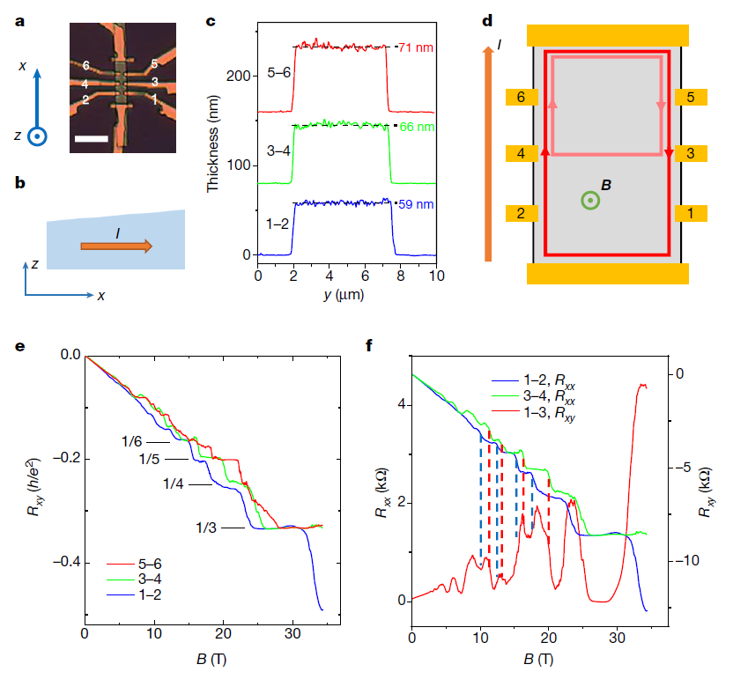 科学家们对量子霍尔效应的研究一直停留于二维体系,从未涉足三维领域。近日,稳态强磁场实验装置(SHMFF)用户复旦大学物理系修发贤教授课题组首先在该领域实现重大突破,在拓扑半金属砷化镉纳米片中观测到由外尔轨道形成新型三维量子霍尔效应的直接证据,迈出了从二维到三维的关键一步。12月17日,相关研究成果在线发表于《自然》期刊。该工作高磁场实验部分在中国科学院强磁场科学中心稳态强磁场实验装置上完成。