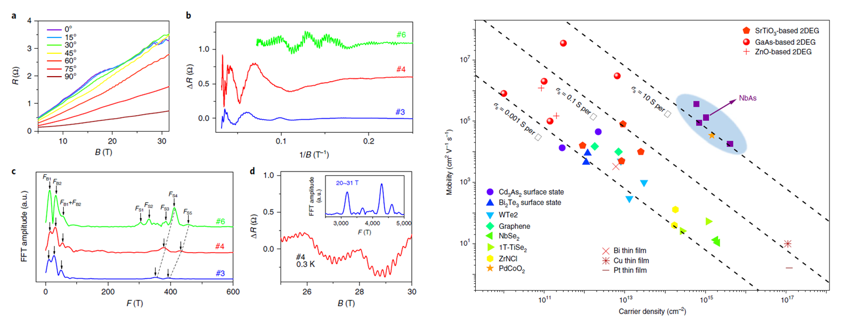 图:左:砷化铌纳米带高磁场下的量子振荡、右:砷化铌纳米带与其它二维材料导电性的对比。