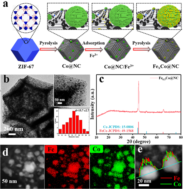 图1. (a) Fe-Co合金催化剂的合成示意图;(b) Fe0.5Co@NC催化剂TEM图(插图:高倍率TEM图和Fe-Co NPs尺寸分布);(c) XRD图;(d) HAADF-STEM图以及相应元素mapping图;(e) Fe-Co合金颗粒的线扫图。
