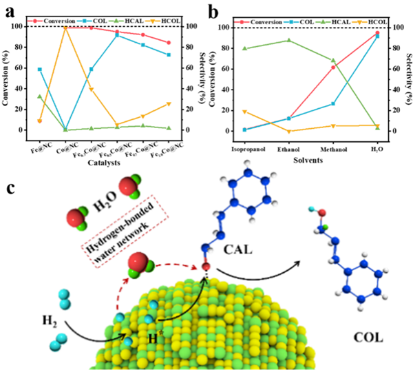 图2. (a) Fe@NC, Co@NC以及Fe-Co合金催化剂催化肉桂醛加氢的催化性能(80℃,2 h,2MPa,H2O);(b) 不同溶剂下Fe0.5Co@NC催化肉桂醛加氢性能对比(80℃,2 h,2MPa);(c) 肉桂醛水相加氢反应示意图。