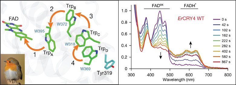 强磁场科学中心谢灿课题组与英国牛津大学、德国奥登堡大学的相关实验室组成的国际合作研究团队应用磁共振光谱学等手段,对几种鸟类的磁感应关键蛋白Cry进行了深入研究,首次发现迁徙鸟类如欧洲知更鸟的Cry蛋白对磁场的敏感性显著大于非迁徙鸟类,这种敏感性主要体现在”自由基对“中纠缠电子的自旋状态的改变。研究还揭示Cry蛋白磁感应机制源于其内部电子行为:在蓝光激发后,Cry蛋白中的辅基FAD发生还原反应,电子在Cry蛋白中TrpA,TrpB,TrpC,TrpD四个保守色氨酸 (tryptophan,Trp) 之间进行跳跃,这种电子跳跃对磁场高度敏感。量子化学实验和理论计算首次发现,这一电子传递过程同时承担了“磁感应”和“信号传递”两种不同的功能,其中第四个色氨酸TrpD对信号传递至关重要。该研究一定程度上揭示了迁徙鸟类对地磁场感知的量子生物学原理,为未来动物磁感应和生物导航研究指明了方向,同时也为仿生导航和生物磁控技术的发展提供了理论指导。