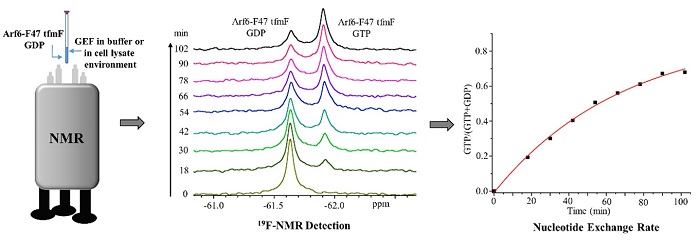 研究人员以小GTP酶Arf6为研究对象,利用19F非天然氨基酸标记和19F核磁共振,开发出快速、精确并且能够适用于生物复杂环境的Arf6 GEF活性检测新方法。该方法的相关设计思路能够拓展到其他小GTP酶的GEF/GAP活性检测,具有一定普适性。