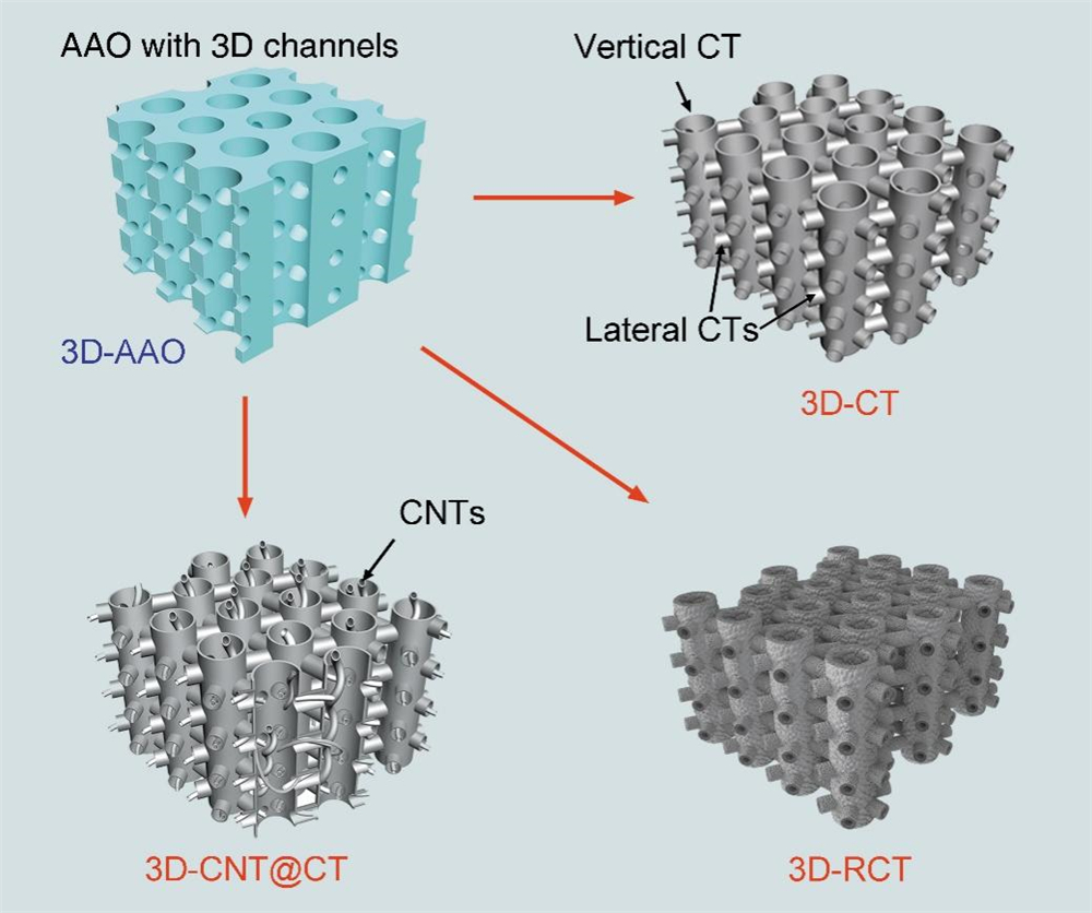 研究团队从2015年开始该项研究,经过长期攻关,成功研发了由“管中管”结构的碳管相互连接组成的三维碳管网格膜。这种“一体化”的三维碳管网格膜,不仅取向性高、结构稳定、导电性好,而且是一种开放式多孔结构,因此有望满足小型化高性能双电荷层滤波电容器对电极材料的要求。为了获得这种独特的结构,科研人员首先对含少量杂质Cu的铝片进行阳极氧化,获得了孔壁上含有均匀分布的Cu杂质颗粒的有序垂直多孔氧化铝模板;随后用磷酸选择性腐蚀掉模板孔壁上的含Cu杂质颗粒,得到了均匀分布的横向孔道,这些横向孔道将有序排列的垂直孔道之间相互连通,获得了一种三维互连多孔氧化铝模板(简称为3D-AAO,图1左上所示)。进而,采用化学气相沉积(CVD)方法,利用模板孔道的空间限域效应,在多孔模板的垂直孔道和横向孔道中生长碳管(CT),选择性腐蚀掉氧化铝模板后,获得了垂直碳管与横向碳管通过化学键互连的三维碳管网格膜(简称为3D-CT,图1右上所示)。