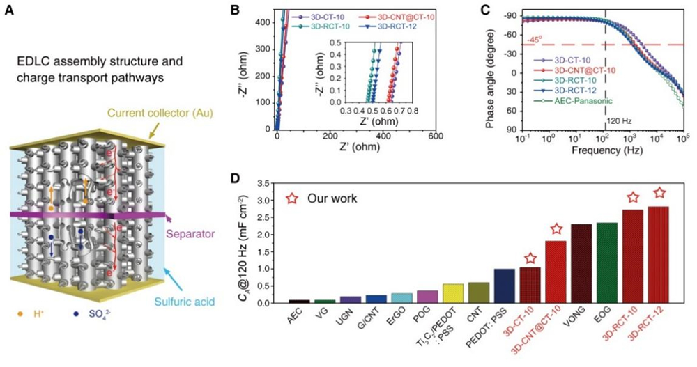 图2. 基于三维互连碳管网格膜的双电层电容器示意图(A)及其阻抗(B)、频率响应(C),以及面积比电容与其它结构电极材料的对比(D)。