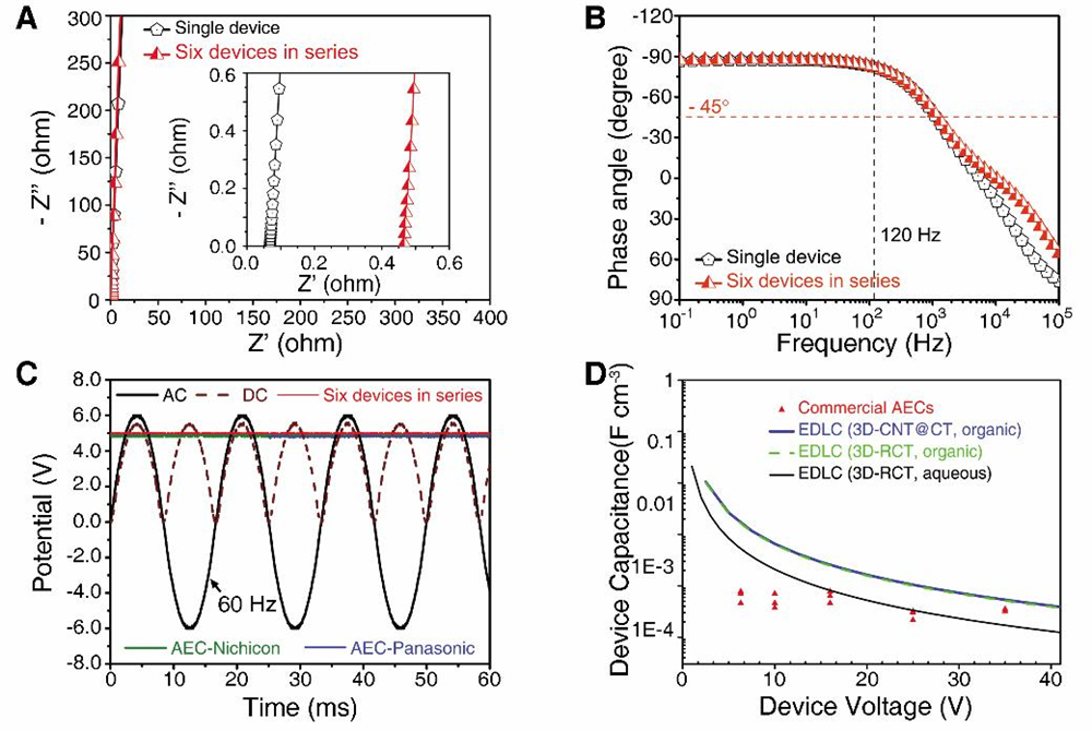 随后,科研人员以上述三维碳管网格膜直接做电极,构建了一系列尺寸大小不同的对称型双电荷层电容器(图2A为示意图),研究发现这些器件不仅具有理想的电容器特征(图2B),而且具有很好的频率响应性能(120赫兹频率下的相位角<-81o,图2C)和非常高的面积比电容(以3D-RCT 组装的电容器在120 赫兹下对应的面积比电容为2.81 mF cm-2,图2D)。为了满足对较高电压交流线路滤波的需求,科研人员又将6个相同的电容器串联起来,发现串联后仍然保持理想的电容特性 (图3A),表现出与单个电容器同样好的频率响应性能(120赫兹下的相位角<-82o,图3B),当将其用于120赫兹交流线路滤波时,发现具有很好的滤波性能(图3C)。
