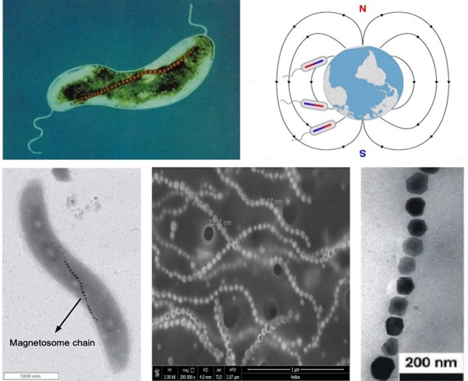 图1 :趋磁细菌磁导航及其链状排布的磁小体“生物罗盘”