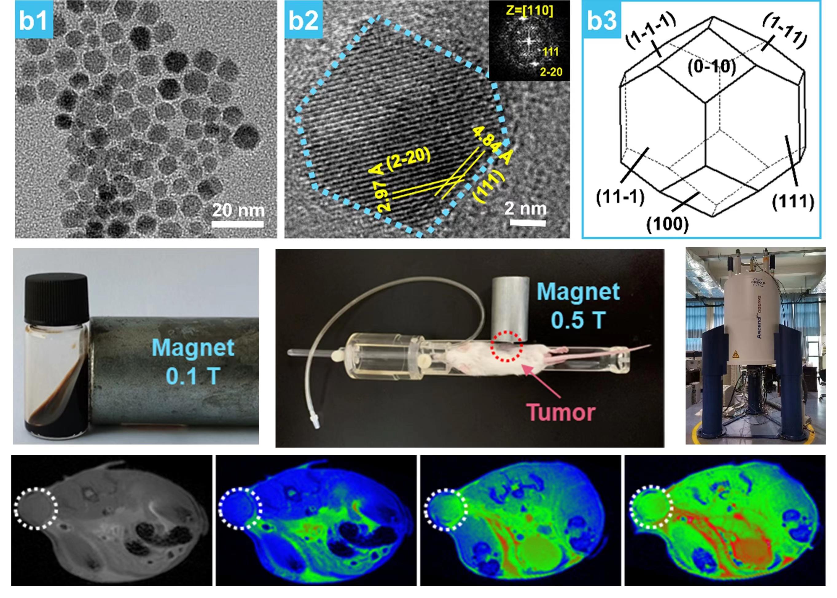 图3:类磁小体具有与天然磁小体一样晶体形貌与磁学特性,可以高效响应外加磁场,实现针对肿瘤组织的靶向富集与高效渗透。(MRI实验在稳态强磁场实验装置SM3上完成)