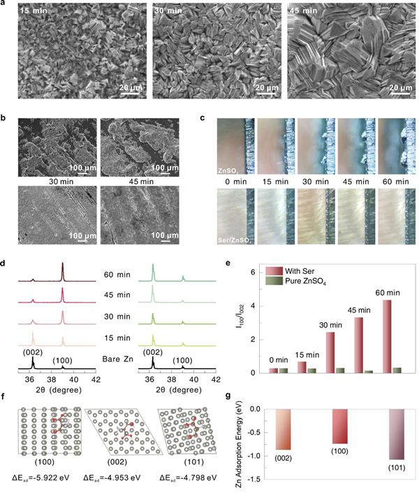 图 2. ( a) 10 mA cm-2下, Zn在 Ser/ZnSO4电解质中沉积的 SEM形貌演变图,比例尺: 20 μ m; (b) 10 mA cm-2下,在纯 ZnSO4(上图 )和 Ser/ZnSO4(下图 )电解质中沉积的 Zn SEM形貌演化图像,比例尺: 100 μm; ( c) Zn电极沉积 0、 15、 30、 45、 60 min后的原位光学显微镜图像(上方为 ZnSO4电解液中,下方为 Ser/ZnSO4电解质中沉积); ( d) 10 mA cm-2下,锌在纯 ZnSO4(右 )和 Ser/ZnSO4(左 )中沉积不同时间的 XRD图; ( e-d)图中 (100)和 (002)面之间的强度比; ( f) Ser+吸附在 Zn(002)、 (100)、 (101)表面的图示及其相应吸附能; ( g) Ser+吸附在 Zn晶面后, Zn离子在不同晶面上的吸附能。