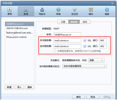 科技云回复:发件和收件服务器都要配置为 mail.cstnet.cn ,咱们证书和这个域名绑定了。