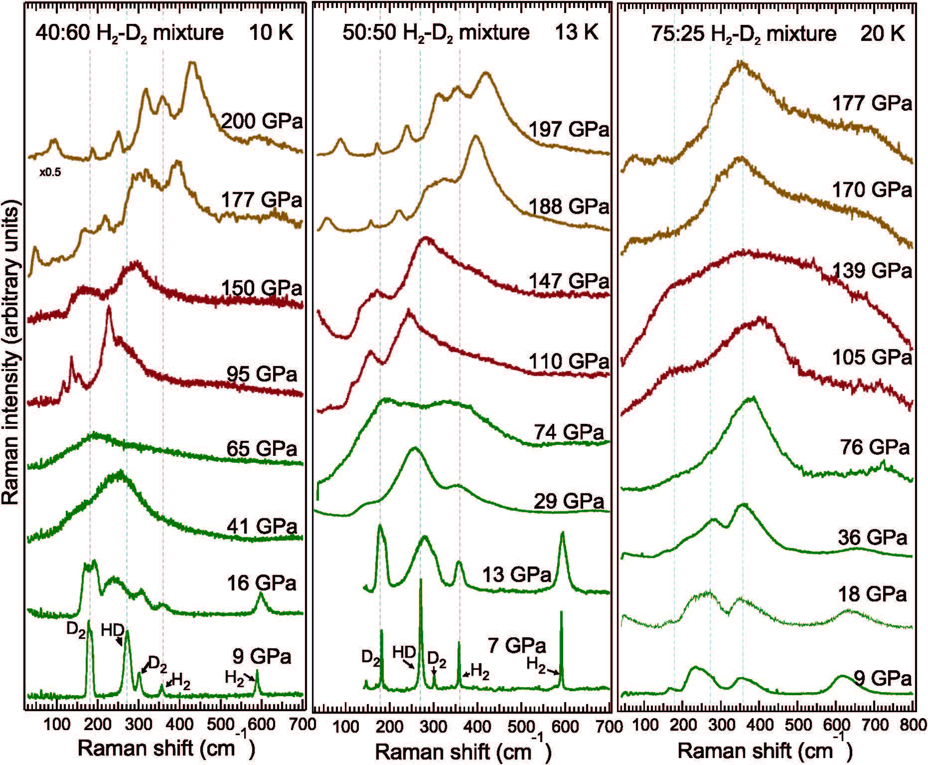 图2. 三种不同比例的氢氘混合物(氢和氘的比例分别为 75:25 = 3:1,50:50 = 1:1和 40:60 = 2:3)的高压低温拉曼光谱,温度在10-20 K之间,压力在0-200 GPa之间。