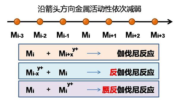 图1. 以金属活动性序列(其它金属省略)中的某种金属Mi为例,图示“伽伐尼反应”、“反伽伐尼反应”、“赝反伽伐尼反应”的区别(注:后两类反应由伍志鲲课题组命名,x为正整数,y可为正整数也可为正小数)。