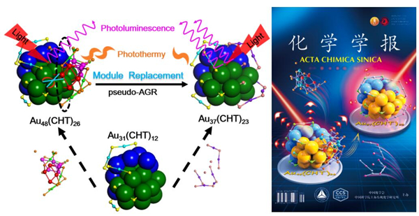 对于金属纳米粒子(团簇)进行组成结构的精确调控是富有挑战性的课题,特别对于涉及三个以上金属原子的局部结构替换(类似于工件中的“模块替换”),还没有报道。研究团队通过“赝反伽伐尼反应”成功实现对环己硫醇配体保护的Au48(SR)26团簇的“模块替换”,得到新团簇Au37(SR)23,两者具有相似的Au31(SR)12模块,但Au48(SR)26的另一块Au17(SR)14可看做被Au6(SR)11替换。进一步实验发现“模块替换”过程抑制了Au48团簇的光热效应,却增强了其荧光,暗示了这两种作用至少可以彼此部分转化。此工作对于调控金属纳米团簇的局部结构以及深入理解团簇光致发光和光热效应的相互作用具有重要意义,以封面论文的形式发表在Acta Chim. Sinica上。金凤鸣和董宏伟为共同第一作者。