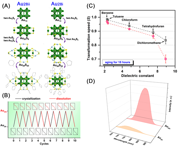 图3. (A) 两种Au28的结构对比,(B) 两种Au28结构的振荡(仅表示10个来回),(C) Au28ii向Au28i转变的溶剂效应和氘代效应,(D) Au28ii和Au28i的荧光性能对比。