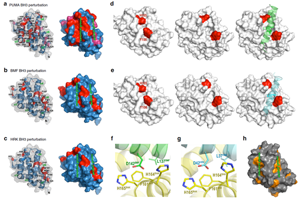 其中a-c是PUMA, BMF, HRK的BH3小肽利用蛋白质核磁共振研究相互作用示意图;d-e是分子动力学模拟的结果示意图;f-g显示BAK F161在相互作用中起重要作用;h显示了BAK疏水表面。