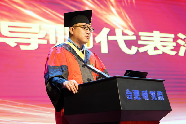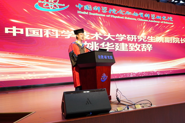 中科大研究生院副院长姚华建致辞,指出毕业生是中国科学技术大学与合肥研究院不断深入开展科教融合战略合作的见证者、参与者和受益者。他勉励同学们坚守初心、锤炼本领,不负使命、追求卓越,用奋斗书写科技报国的青春篇章。