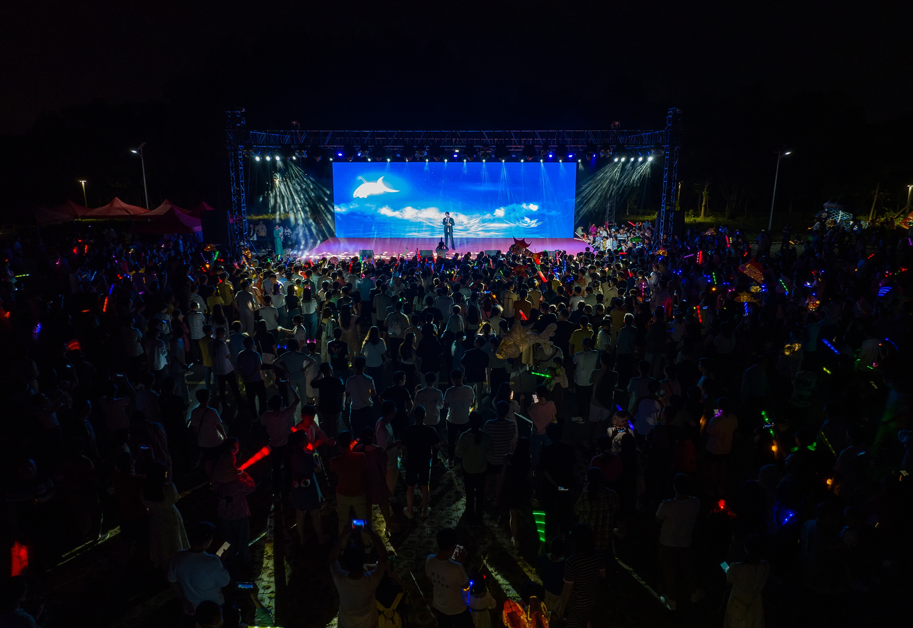 当天晚上,在鱼灯“巡游”队伍的引导下,所有人员汇聚到科学岛中心广场西侧停车场,这里正在举行一场视听盛宴——科学岛尖峰音乐会。在团体舞蹈《FEARLESS》热情演绎中,音乐会一开始现场气氛就被点燃,随后独唱、吉他弹唱、乐队表演、钢琴伴奏合唱等近30个节目轮番上演,除了合肥物质院的学生们,活动还邀请了来自安徽各高校的唱跳达人们,大家轮番展现才艺,唱响青春的风采。活动从晚上7点半持续到11点,1000多位科技工作者和师生们一起“嗨”唱科学岛,打造一场温馨而热烈的“音乐时空之旅”。