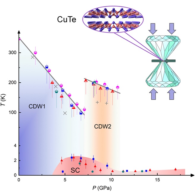 近日,中国科学院合肥物质院强磁场中心低功耗量子材料研究团队与安徽大学研究团队合作,利用金刚石对顶砧技术,结合极低温电输运和变温拉曼测量,在准一维电荷密度波(CDW)材料 (CuTe)中发现压力诱导的新CDW态和超导电性,相关研究结果发表在Cell Press旗下的材料旗舰刊Matter上。