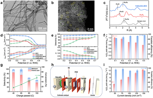 基于此,固体所研究人员利用细菌纤维素为吸附调节剂和碳源,结合湿化学浸渍、高温热解和酸刻蚀的串联工艺合成了具有氧配位结构的Fe单原子/团簇催化剂( FeSAs/ACs-BCC)。球差校正扫描透射电子显微镜(AC-STEM)结果揭示了Fe单原子和Fe团簇的共存,结合X射线精细结构吸收光谱(XAFS)、X射线光电子能谱(XPS),确定了Fe的原子结构。所合成的FeSAs/ACs-BCC催化剂在碱性条件下表现出优异的2e- ORR电催化活性和选择性,起始电位为0.78V(相对于可逆氢电极),H2O2选择性高达96.5%。进一步利用H-型电解池验证H2O2能够通过电催化合成并且可以在电解液中积累,在0.2 V(相对于可逆氢电极)条件下测得H2O2产率达到1.13 0.06 mol gcat-1 h-1,相应的法拉第效率为87.8 4.8%。研究发现,将原位生成的H2O2与电芬顿反应偶联,以乙二醇为反应物,酸化的0.1 M Na2SO4为电解液,在转移100 C电荷后,乙二醇转化率为56.5% 4.5%,甲酸选择性为41.0% 5.0%,显示了电芬顿工艺用于生物质原料氧化升级的可行性。