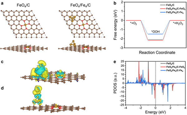 图 2. ( a ) FeO4/C 和 FeO4/Fe4/C 的优化结构模型(上:俯视图,下:前视图);( b ) DFT 计算 2e- ORR 路径的吉布斯自由能图;( c ) FeO4/Fe4/C的差分电荷密度图 ;( d ) FeO4/Fe4/C 吸附 *OOH 中间体的差分电荷密度图;( e ) FeO4 、 FeO4/Fe4/C-FeO4 和 FeO4/Fe4/C-Fe4 中 Fe 原子 d 轨道的投影态密度图。