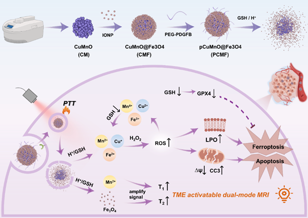 铜基纳米材料具有极强的催化类芬顿反应的能力,可以提高细胞内的活性氧水平,从而抑制肿瘤的生长,但其稳定性较差。为了解决这个问题,团队开发了一种对肿瘤微环境响应的核壳结构铜基纳米复合材料,并将靶向肿瘤细胞的靶标连接到其表面,再借助材料中氧化铁壳层的空间位阻效应的保护,促进该复合材料稳定顺利地到达肿瘤部位。到达肿瘤部位后,该材料会被肿瘤微环境中的弱酸条件和谷胱甘肽瓦解并释放金属离子和超小氧化铁。该过程不仅激活了磁共振成像信号,还消耗了谷胱甘肽,加速了芬顿和类芬顿反应,提高了细胞内的活性氧水平,加剧了细胞内的氧化应激,最终诱导肿瘤细胞凋亡和铁死亡。通过这种方式,可以实现磁共振成像引导的肿瘤治疗,为肿瘤的特异性多模式诊疗提供了新的借鉴。