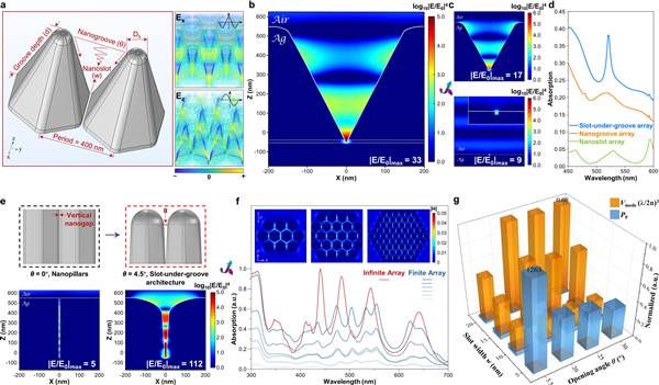鉴于此,科研人员设计了一种独特的“上端为开口向上的锥形槽-下端为矩形窄缝隙”阵列的SERS基底,其中上端的锥形槽和下端的矩形窄缝隙的尺度均为纳米级,因此简称为“锥形纳米槽-隙阵列”。时域有限差分法(FDTD)模拟结果表明,当上端锥形槽的开口角度从最初的0 逐渐张开到4.5 时,光场被局域在开放空腔内,位于上端的“锥形沟槽”激发的二维间隙表面等离激元(Two-Dimensional Gap-Surface Plasmons, 2D GSPs)模式和位于“下端约5 nm的矩形间隙”激发的局域表面等离激元共振(localized surface plasmon resonance, LSPR)模式相互耦合,产生强耦合的场增强效应,形成大模式空间分布的强耦合场(图2),预示着这种金属“锥形纳米槽-隙阵列”在SERS检测领域具有广阔的应用前景。
