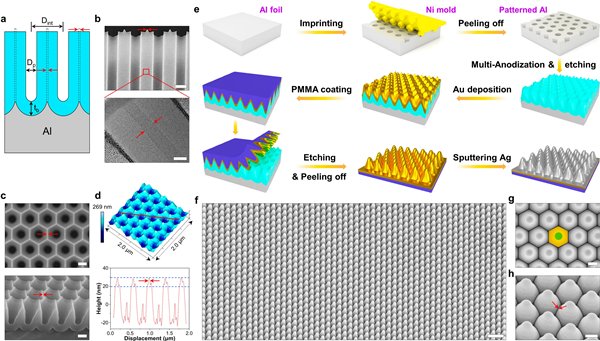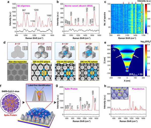 为了能够大规模可重复地制备这种金属“锥形纳米槽-隙阵列”SERS基底,科研人员以预先经过大面积凸模压印的铝片作为起始材料,采用“阳极氧化与扩孔”多次循环进行的新技术,制备了大面积有序排列的“锥形纳米槽-隙阵列”的多孔阳极氧化铝(AAO)模板;进而采用在这种模板表面蒸镀贵金属与聚甲基丙烯酸甲酯PMMA等相关技术,成功构筑了一系列具有不同几何特征与尺寸的金属“锥形纳米槽-隙”阵列(图3)。在SERS检测过程中,上端开口的锥形沟槽结构可以高效抓捕大尺寸的分析物,并通过激发二维间隙表面等离激元2D GSPs充当光收集器;位于下端的纳米间隙充当带有能量约束的纳米天线,在开放空腔中激发强烈的光与物质相互作用。得益于大的模式空间分布强耦合场,这种金属“锥形纳米槽-隙阵列”可作为一类通用(Universal)的SERS基底,用于快速检测具有不同尺寸大小的多种目标分析物。实验结果表明,该金属“锥形纳米槽-隙阵列”SERS基底对小尺寸探针分子罗丹明R6G的检测灵敏度低至10-14 M,增强因子高达1.192 108,检测信号相对标准偏差(RSD)仅7 %。进而,采用这种新型SERS基底,实现了对约2 nm大小的阿兹海默疾病标志物、长度为8.3 nm-26.7 nm的牛血清白蛋白以及约160 nm大小的SARS-CoV-2假病毒的有效捕获和快速灵敏识别(图4),表明这种新型SERS基底具有很好的普适性和可靠性,为用SERS技术检测不同尺寸大小的各种待检物开辟了新途径,具有重要的理论意义和实际应用价值。