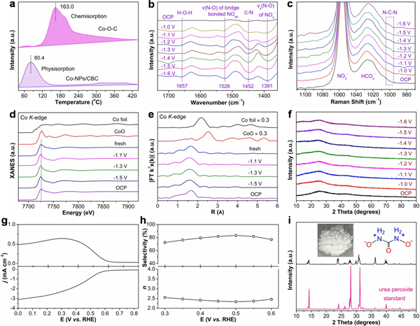图2. (a)Co-NPs/CBC和Co-O-C的CO2-TPD图;Co-O-C在CO2饱和的0.1M KHCO3+0.05M KNO3电解质中,不同施加电位下电催化C–N偶联对应的(b)Operando ATR-SEIRAS光谱和(c)Operando Raman光谱;Co-O-C和标准样品在不同施加电位下电催化C–N偶联对应的Co K边(d) XANES光谱和 (e) R空间EXAFS光谱; (f) Co-O-C在不同施加电位下电催化C–N偶联对应的XRD谱图; (g) 在O2饱和的0.1M KHCO3+0.05M KNO3电解质中,在1600 rpm下Co-O-C的LSV曲线;(f)基于RRDE测量计算的H2O2选择性和电子转移数(n);(i) 实验制备的过氧化脲和标准样品的XRD对照谱图(插图是所制备的过氧化脲的实物照片和相应的化学结构)。