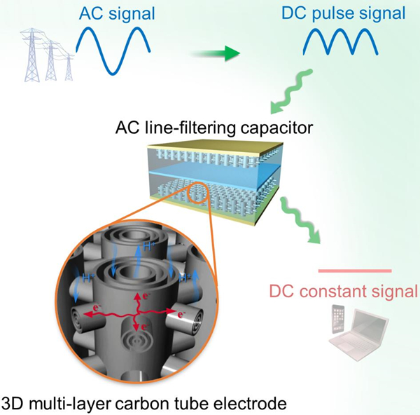 滤波电容器在交/直流电转换中起到平滑整流信号中纹波的作用,对高端电力电子设备的稳定运行至关重要。铝电解电容器(简称AECs)占据了这一领域的大部分市场,但其容量小、体积大,通常是电路中最大的元件之一,严重制约了电子器件的小型化发展。双电层超级电容器(简称EDLCs)的比电容比商用铝电解电容器AECs高几个数量级,如果能将其用于滤波,有望满足电子设备小型化发展的需求。然而,传统的双电层超级电容器EDLCs由于其多孔碳基电极中的弯曲、复杂孔结构,虽然具有高的容量,但其响应频率一般低于1Hz,不能对市电滤波以供电子设备使用。