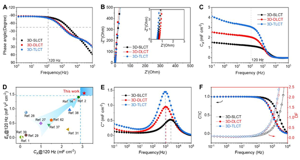 科研人员以这种三维互连套娃碳管网格膜为电极,构筑了对称型双电层电容器。研究发现三层套娃碳管电极构建的器件,在频率120 Hz下表现出-80.1 的阻抗相位角和0.25毫秒(ms)的较短电阻-电容(RC)时间常数,表明该电极类似于有序光滑的离子快速输运通道,促进了离子的快速分布。器件的面积比电容达到3.08 mF cm-2,比商用AECs的(约0.08 mF cm-2)高2个数量级,并且也高于迄今报道的三明治构型的水系滤波超级电容器。此外,还发现器件的损耗因子低、储能效率高。