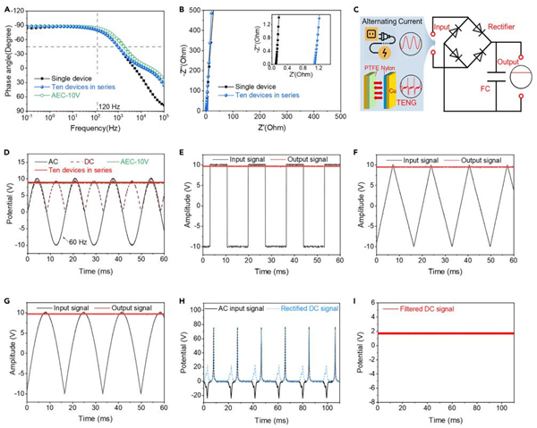 图 5. (A-B) 单个器件及器件组 (10 个器件串联 ) 性能对比; (C) 滤波电路示意图; (D) 器件组与商用铝电解电容器对交流信号滤波效果对比; (E-G) 器件组对方波、三角波和任意波的滤波效果; (H-I) 器件组对摩擦纳米发电机发出电信号的滤波效果。