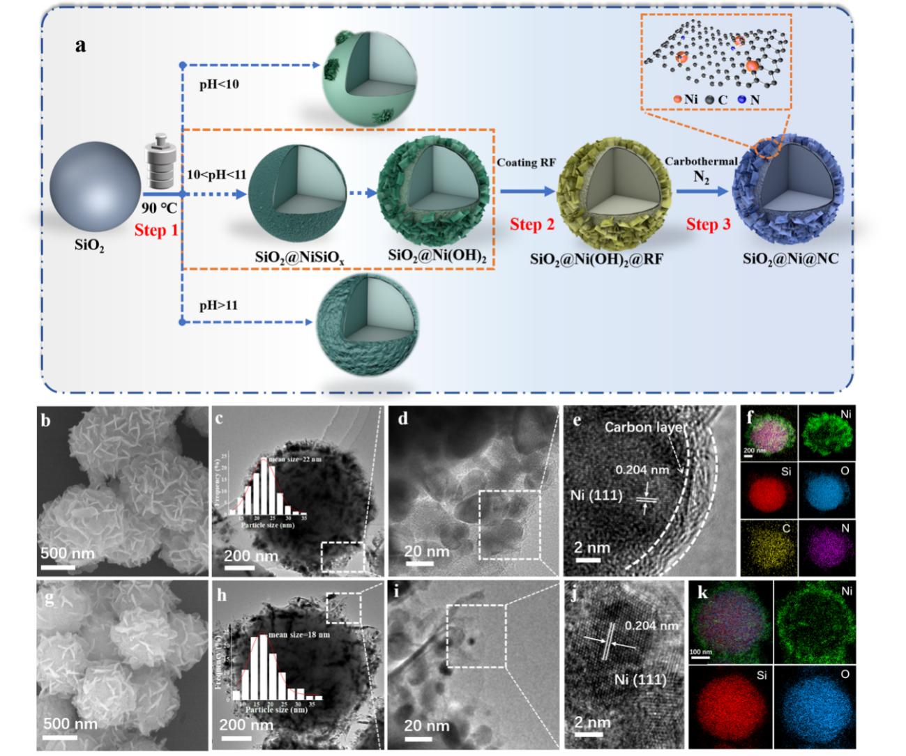 图1. (a) SiO2@Ni@NC的合成示意图;SiO2@Ni@NC催化剂的(b) SEM, (c, d) TEM, (e) HRTEM和(f) EDS能谱图; SiO2@Ni催化剂的(g) SEM, (h, i) TEM, (j) HRTEM和(k) EDS能谱图。