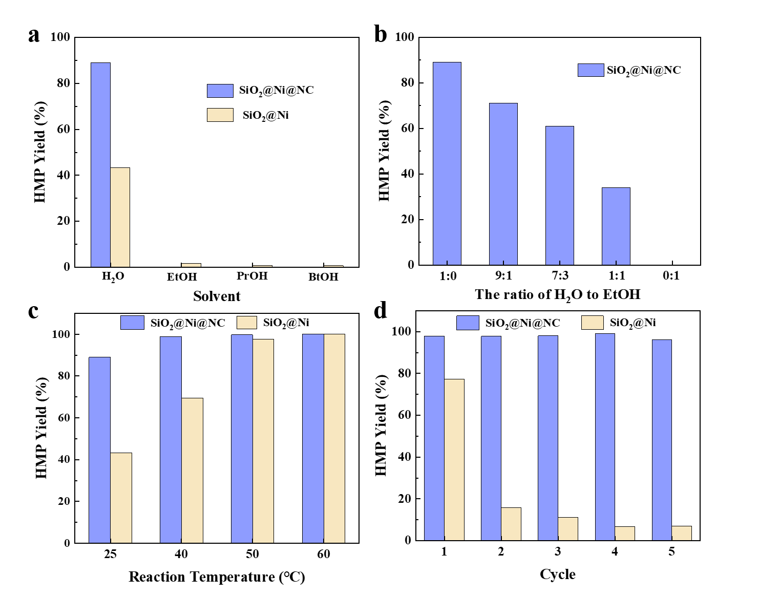 鉴于此,固体所研究人员将金属镍封装在氮掺杂的碳和二氧化硅复合两亲性载体中(SiO2@Ni@NC),并将此催化剂应用于香草醛的水相加氢反应中。研究发现,SiO2@Ni@NC催化剂在水相反应中展现出了优异的活性和稳定性,在室温下可以实现香草醛到4-羟甲基-2-甲氧基苯酚(HMP)的近100%转化,且在5次循环中活性没有明显降低。