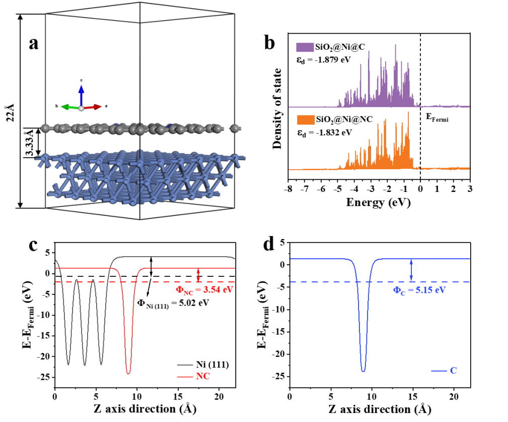 图3. (a)SiO2@Ni@NC的计算模型图;(b) SiO2@Ni@C和SiO2@Ni@NC的态密度;(c)Ni (111)晶面和NC以及(d) C的功函数。
