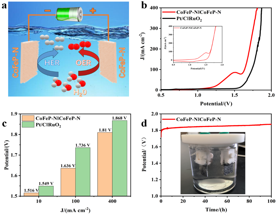 该研究通过水热、磷化和低温等离子体三步合成方法,成功制备了用于析氢和析氧的双功能铁、氮共掺杂CoFeP-N纳米线。铁原子的掺杂可以与钴原子形成协同效应,改变电催化剂的电子结构,增强其本征活性,获得优于单一金属磷化物的HER和OER活性。等离子体处理引入氮元素以提高催化剂的导电性,并向电极材料提供额外的电子,从而提高电极的电子转移速率。此外,CoP3和FeP2之间形成的非均相界面可以作为活性反应中心,对提高HER和OER的性能起着重要作用。