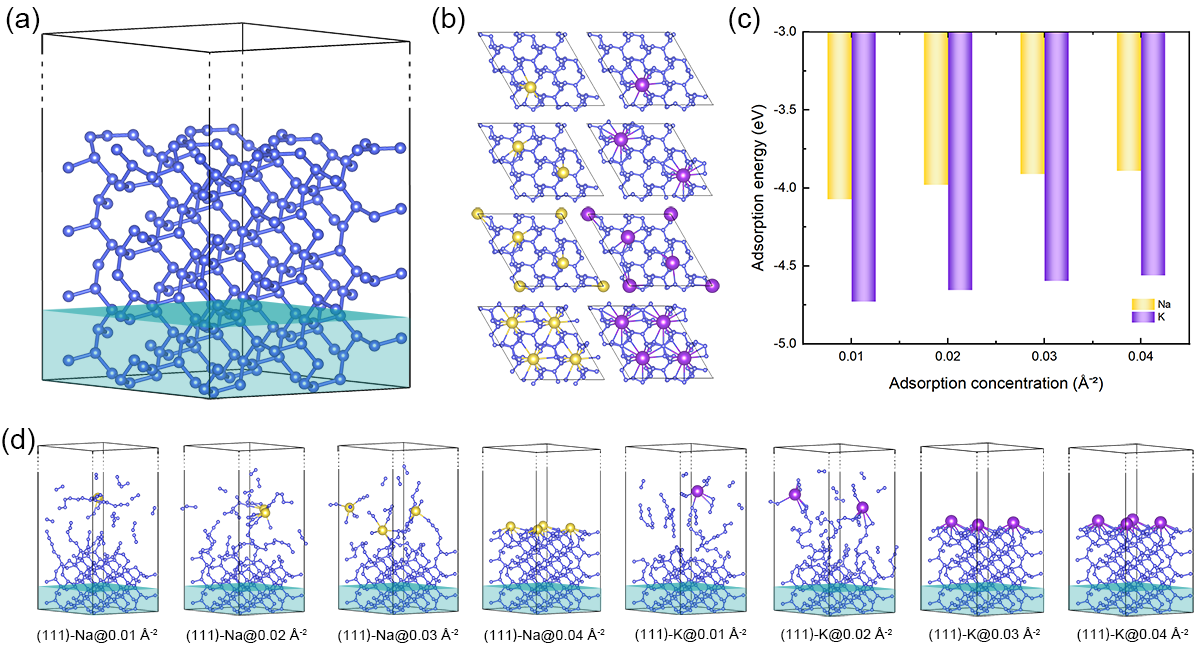 图1. cg-N表面吸附Na,K原子的性质对比:吸附模型(a)和(b),不同吸附浓度下的吸附能(c),300 K下不同吸附浓度时的分子动力学模拟(d)。