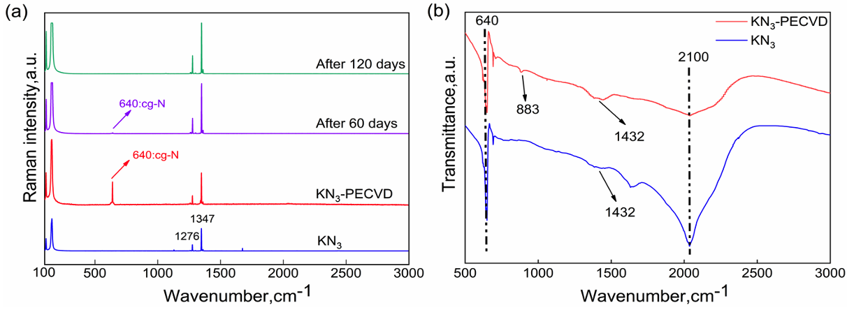 在此基础上,基于钾的电负性比钠更弱,提出了采用更安全和更便宜的叠氮化钾来替代叠氮化钠作为前驱体来合成cg-N的方法,如图1 所示,第一性原理计算结果表明钾吸附在增强cg-N表面稳定性上要远优于钠吸附。基于自主研建的等离子增强CVD装置,不借助纳米限域效应,成功在常压下合成了cg-N,样品可以保存2个月以上(图2)。如图3所示,同步热分析(TG-DSC)测量结果表明cg-N具有488℃的热分解温度,与理论预测的477 ℃分解温度相符合,尖锐的分解放热峰表明其具有典型的高能量密度材料热分解行为;激光等离子驱动微爆法测试表明样品的爆速有显著提升。由于不需要高压或碳纳米管束缚且前驱体更安全和便宜,因而该合成方法具备宏量制备和工程应用的技术优势。