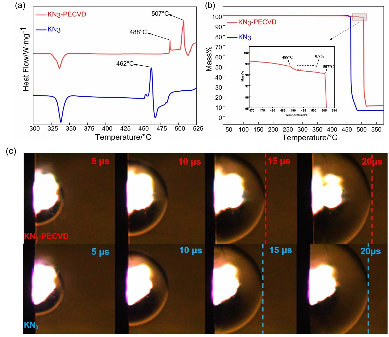 图3. 同步热分析(a, b)与微爆测试结果(c)。